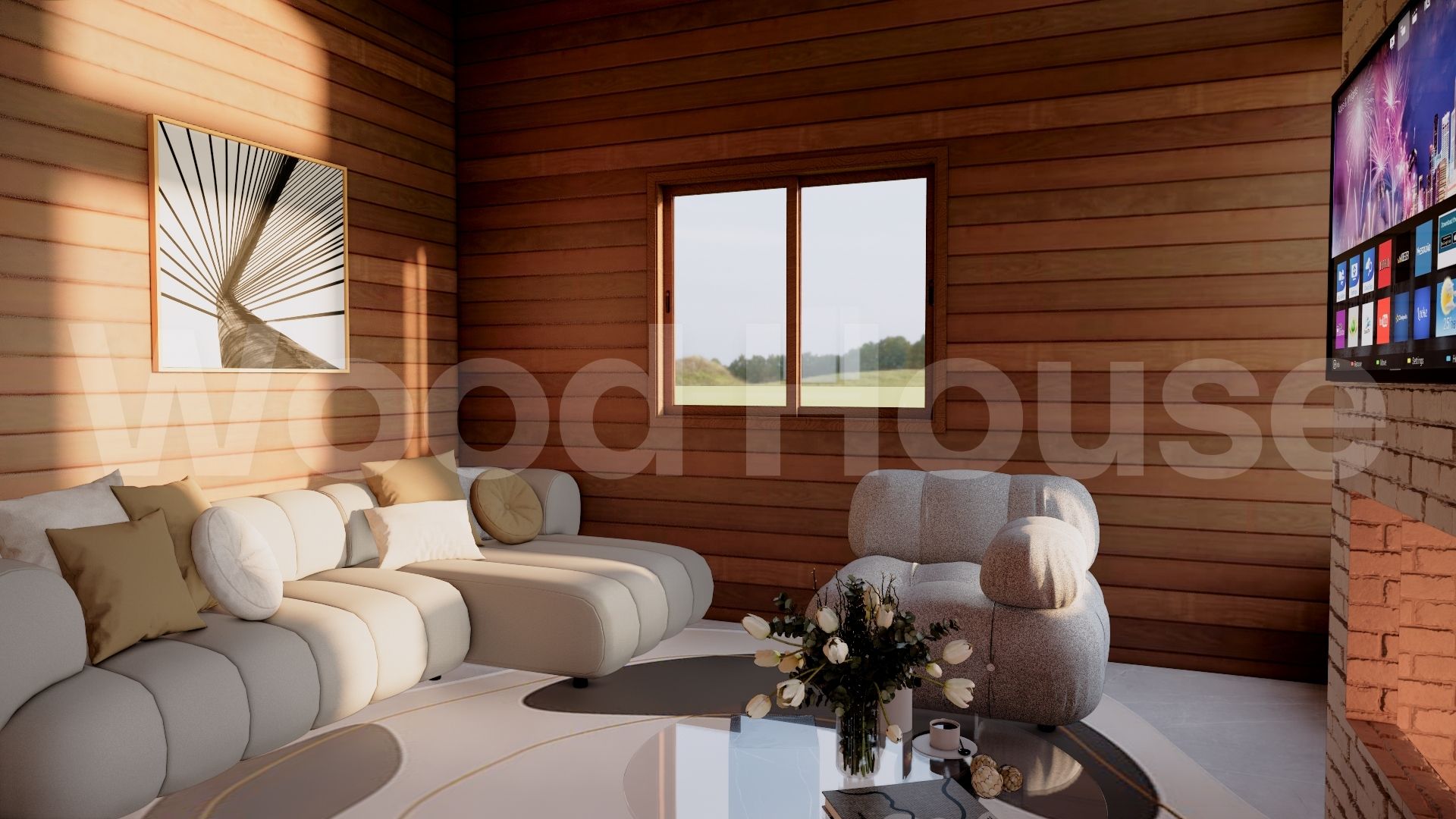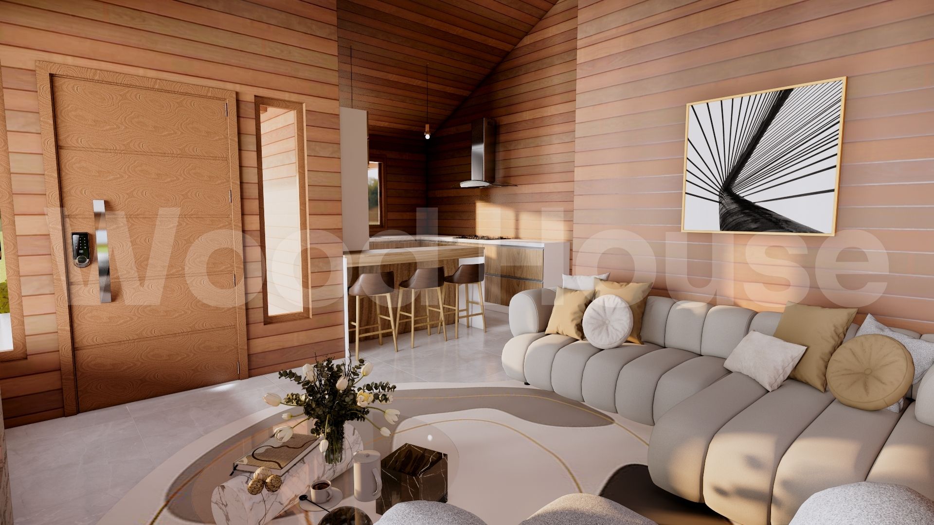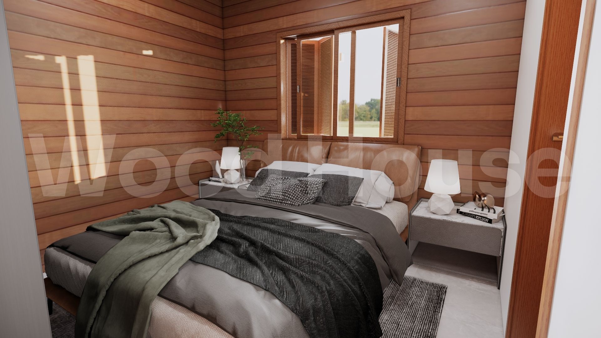 03 Dormitórios, sendo uma suíte. Parede externa nobre à escolha do cliente, conforme disponibilidade. Estrutura em eucalipto com forro em pinus de 1ª ou PVC branco.