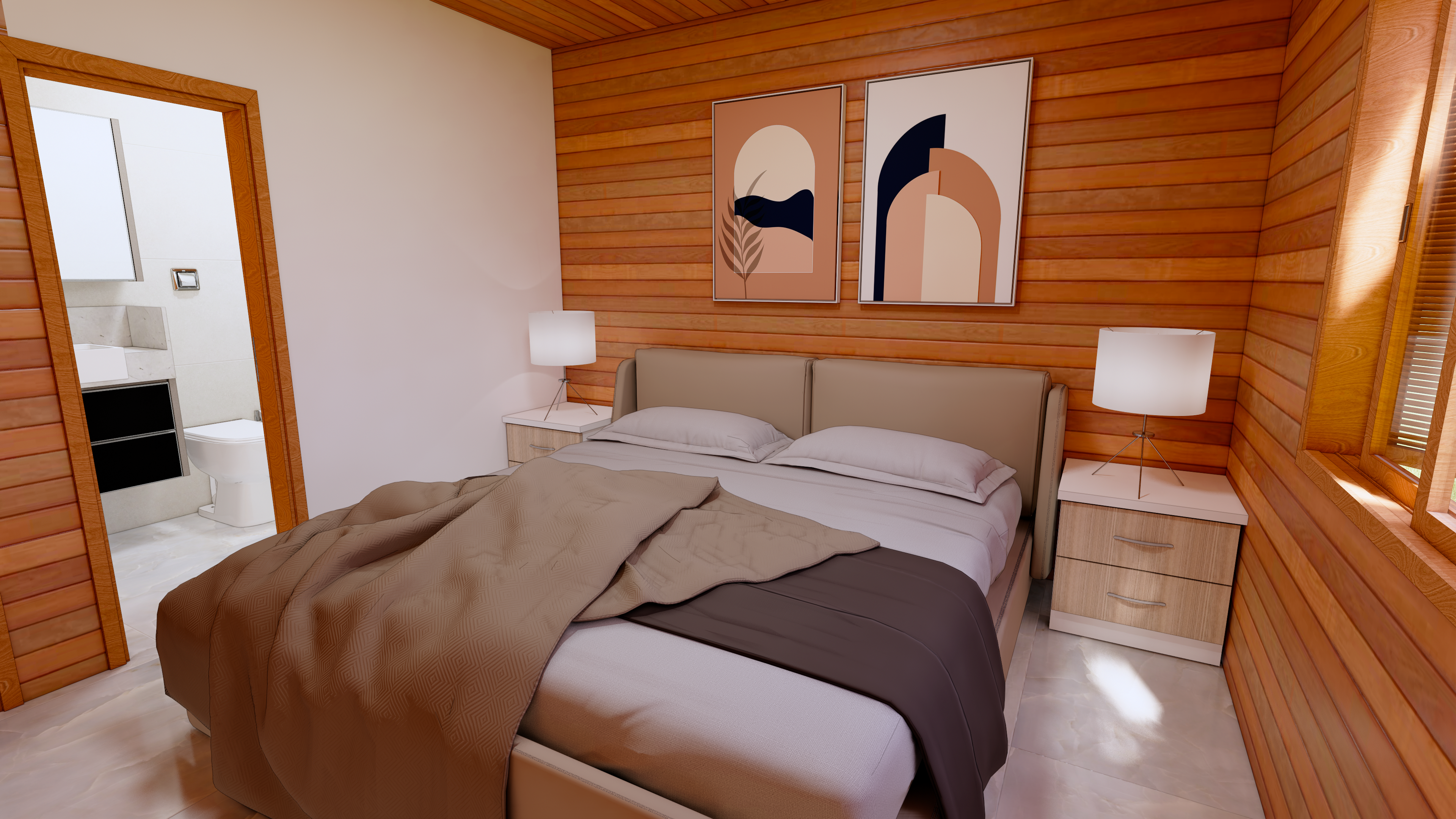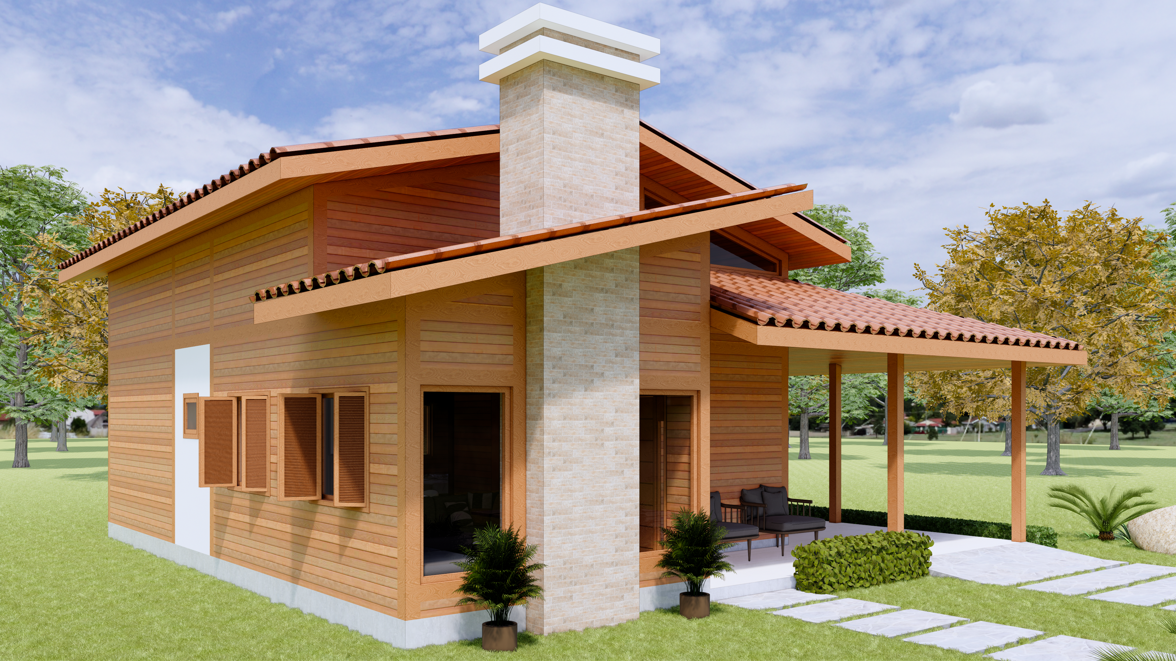 02 Dormitórios, sendo uma suíte. Parede externa nobre à escolha do cliente, conforme disponibilidade. Estrutura em eucalipto com forro em pinus de 1ª ou PVC branco.